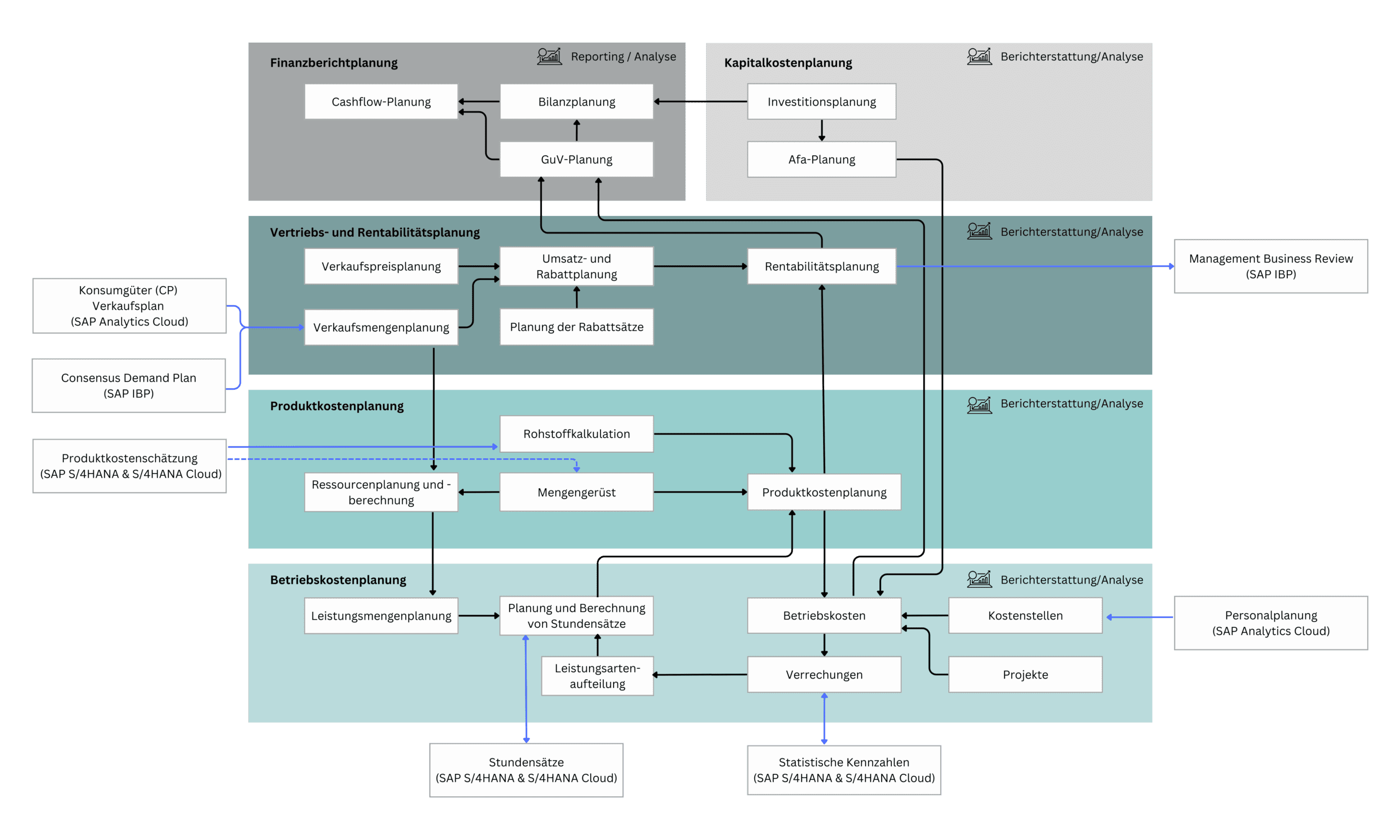 Die einzelnen Planungsmodule werden je nach Ihrer Anforderung durchlaufen. Je nach Modul spielt die Integration hier einen entscheidenden Vorteil. Die Daten, welche in vorgelagerten Schritten geplant wurden, können direkt vom anfordernden Planungsmodul verarbeitet werden. Nach Abschluss und Freigabe der jeweiligen Planungsmodule können Folgeschritte wie z.B. Tarifplanung durgeführt und in das S/4HANA zurückgespielt werden. Im Folgenden wird die Integration von FP&A dargestellt, um Ihnen einen groben Überblick zu verschaffen, welche Teilplanungen untereinander kommunizieren und miteinander verbunden sind.